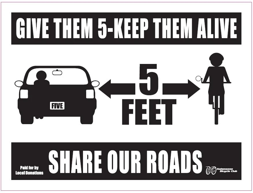 A number of organizations and local bike shops have made these free “Give Them 5 - Keep Them Alive” yard signs available in the past*, including: